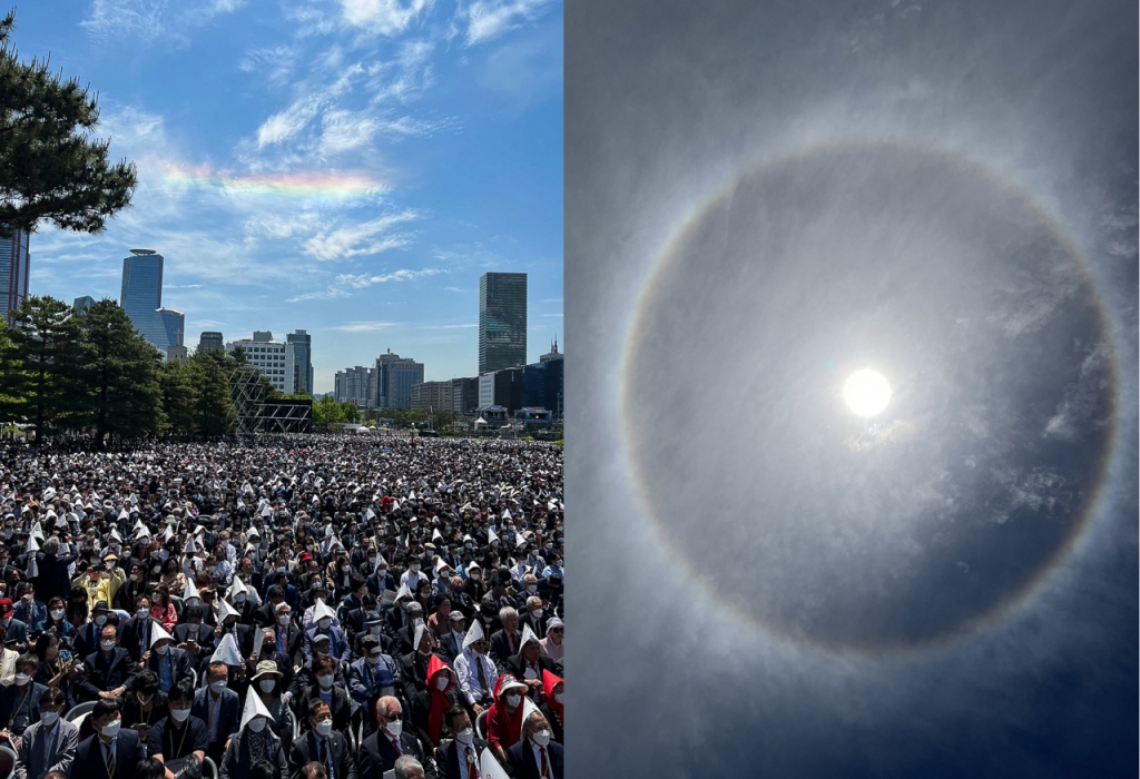 제20대 윤석열 대통령 취임식날 서울 하늘에 무지개가 떴다. 같은 시각 문재인 전 대통령의 경남 양산 사저 인근엔 햇무리가 관측됐다.