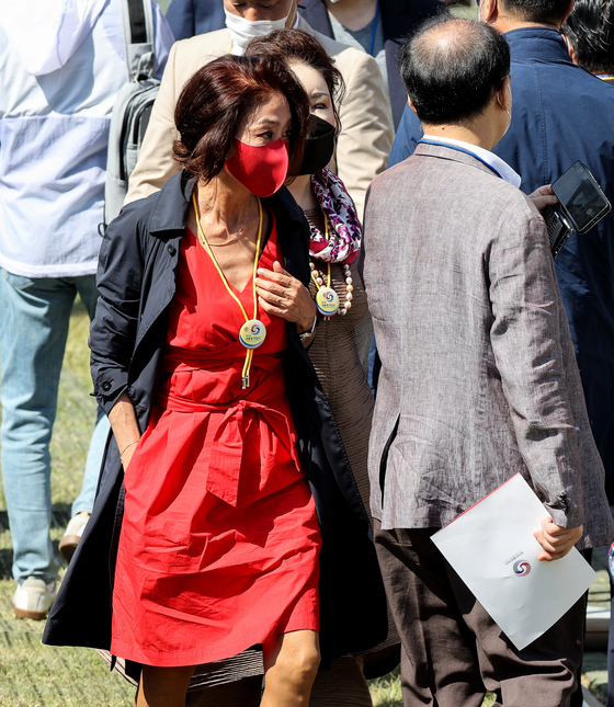 김씨는 붉은 드레스를 입고 붉은 마스크를 썼다. 태진아는 흰 정장에 붉은 넥타이로 포인트를 줬다. 윤 대통령 소속 당이자 이날부터 집권 여당이 되는 국민의힘 상징색을 고른 것으로 보인다.