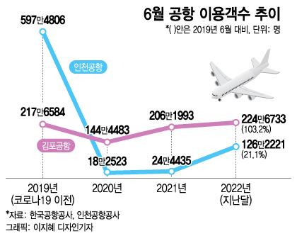 코로나19로 영업에 큰 타격을 입었다 엔데믹화(풍토병화)로 반등하고 있는 관광업계 역시 확산세를 관망하고 있다. 지난달 김포공항을 이용한 여행객은 224만6733명으로 코로나19 이전인 2019년 같은 달 217만6584명을 넘어섰다. 지난달 인천공항 이용객은 전년 같은 기간보다 5배 이상(24만4435명→126만2221명) 뛰었으며 2019년 같은 달과 비교하면 21.1% 수준을 회복했다.