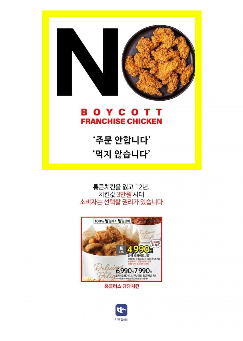 19일 복수의 온라인 커뮤니티에는 '보이콧 프랜차이즈 치킨', '주문 안 합니다', '먹지 않습니다' 등의 문구가 담긴 불매 운동 포스터 사진이 퍼졌다. 이 포스터는 온라인 커뮤니티 디시인사이드 내 치킨 관련 커뮤니티 '치킨 갤러리'에서 만들어져 여러 곳으로 퍼졌다.