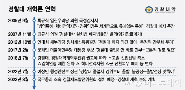 경찰대 폐교론이 제기된 건 이번이 처음이 아니다. 경찰대 개혁은 노무현정부부터 이명박·박근혜·문재인·윤석열정부를 거치면서 정권이 바뀔 때마다 거론되고 했다.