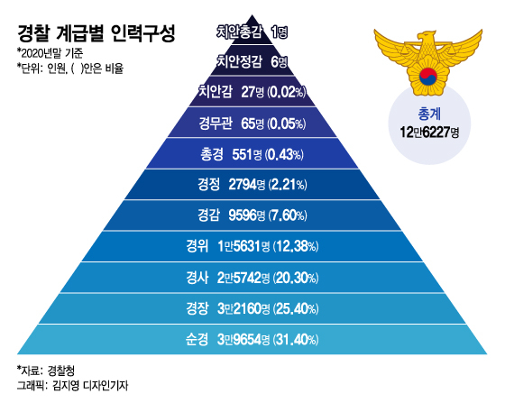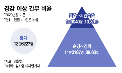 경찰조직 자체를 개선해야 한다는 주장도 나온다. 경찰청에 따르면 2020년 말 기준 경감 이상 간부가 전체 경찰에 10%에 불과하다. 피라미드형 계급구조를 항아리형으로 개선해야 한다는 지적이 나오는 이유다.