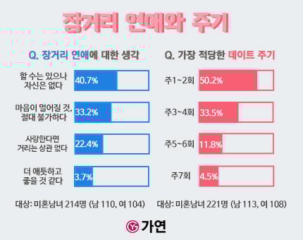 다음 '몸이 멀어지면 마음도 멀어질 것, 절대 불가하다(33.2%)', '사랑한다면 거리는 상관없다(22.4%)', '마음이 더 애틋하고 좋을 것 같다(3.7%)' 순이었다. 좋은 관계를 유지할 자신이 없거나 불가하다는 응답이 높은 것으로 보아 대체로 장거리 연애는 선호하지 않는 것을 알 수 있다.