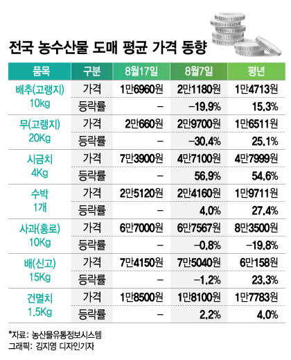 가락동농수산물시장 상인들은 매일 경매에 풀리는 물량에 따라 가격의 등락은 있어도 추석 때까지 배추를 중심으로 일부 채소류의 가격 상승이 계속될 것으로 전망했다.