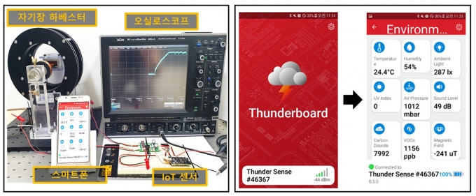 부경대 황 교수팀이 개발한 하이브리드 자기장 에너지 하베스팅 소자는 기존보다 약 10배 높은 최대 60 mW의 에너지 출력을 달성했다. 연구팀은 이 소자를 적용해 습도, 온도, 자외선, 광량, 유기화합물, 이산화탄소, 압력, 소음, 자기장을 실시간으로 감지하는 다기능 IoT 센서의 연속 구동에도 성공했다.