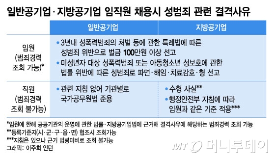 중앙정부 산하 공기업에 성폭력으로 처벌받았거나 미성년자 성폭력·아동청소년 관련 성범죄를 저지른 경우 일부 결격사유로 채용하지 않을 수 있는 근거는 마련돼 있지만 공기업 측이 이같은 범죄사실 유무를 조회할 방법은 없다. 그나마 지방자치단체를 통해 '수형사실' 등을 조회할 수 있도록 돼 있는 지자체 산하기관보다 중앙정부 산하 공기업 등의 채용 기준이 더 느슨한 셈이다.