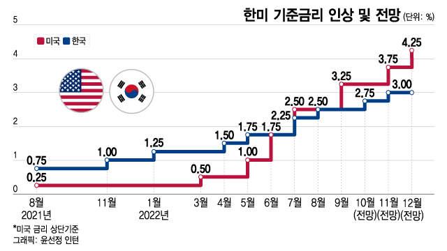미국 연준은 21일(현지시간) 기준금리를 또 0.75%포인트 인상해 미국의 기준금리가 3.00~3.25%로 올라섰다. 이로써 한국 금리(2.50%)를 크게 넘어서게 됐다.