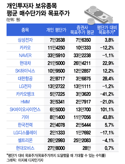 개인이 가장 많이 매수한 삼성전자의 경우 지난 7일 기준 개인 평균단가는 7만3538만원이다. 7일 기준 삼성전자 주가가 5만6000원으로 개인 평균단가 대비 손실률은 24%다. 하지만 증권사들은 현재 삼성전자의 평균 목표주가를 개인 평균단가보다 3.8% 높은 7만6350원으로 제시하고 있다.