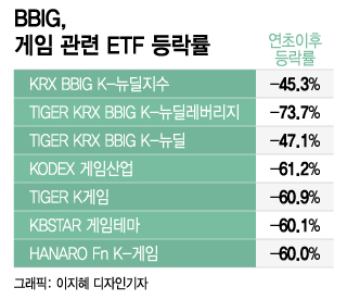 국내 대표 성장주로 주식시장을 견인했던 'BBIG'(배터리·바이오·인터넷·게임) 상품들이 이제는 투자자들의 골칫거리가 되고 있다. 관련 ETF(상장지수펀드)의 수익률이 반토막 나거나 70%까지 떨어져 개인 투자자들 입장에서는 손절을 할지, 소위 '물타기'를 할지 고민이 깊어진다.