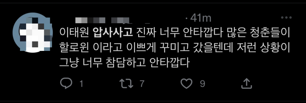 누리꾼 A씨는 "이태원 압사사고는 매우 안타깝다"며 "많은 청춘들이 할로윈이라고 이쁘게 꾸미고 갔을텐데 저런 상황이 너무 참담하고 안타깝다"고 적었다.