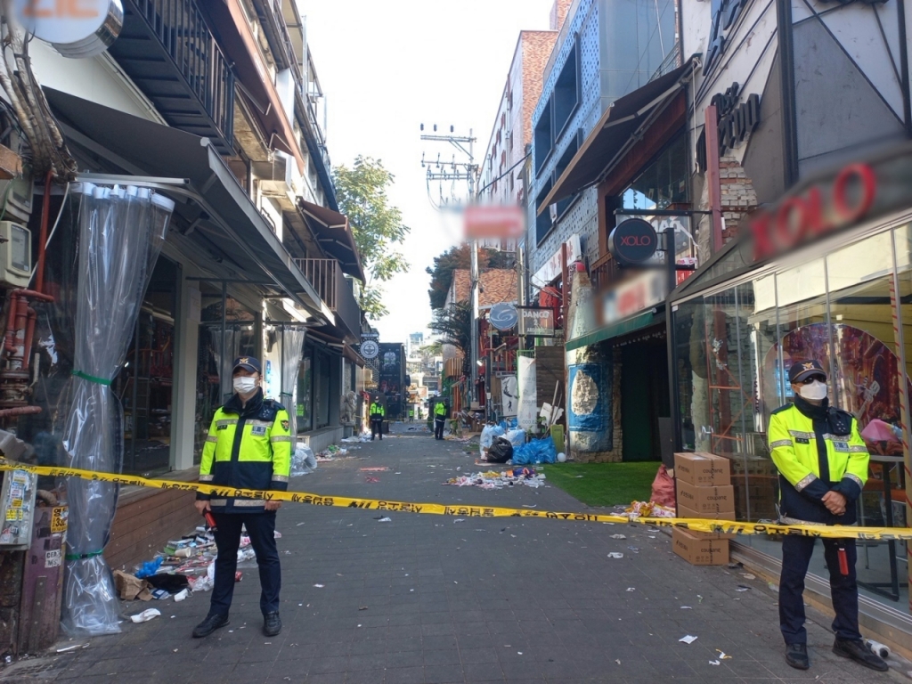30일 오전 10시40분 기자가 찾은 서울시 용산구 이태원동 119-7 일대 골목은 텅 비어있었다. 경찰이 쳐놓은 폴리스라인이 사람들의 통행을 막고 있었고 길가엔 버려진 쓰레기만 나뒹굴었다. 용산소방서 긴급구조통제단도 천막 하나만 남기고 모두 철거했다. 환경미화원 10여 명이 사고 현장을 제외한 나머지 거리를 청소하고 있었다.