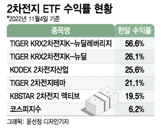 2차전지 ETF(상장지수펀드) 수익률이 고공행진하고 있다. 한때 주식시장을 견인했던 2차전지 관련주가 다시 주식시장 달구면서다. 2차 전지 관련 기업들이 3분기 호실적을 내놓은 가운데 앞으로의 실적 전망도 밝아 2차전지 ETF 주가에 대한 긍정적인 평가가 나온다.