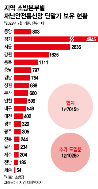 시·도소방본부의 경우 단말기 보급이 완료되지 않은 것으로 확인됐다. 소방청과 중앙119구조본부, 시·도 소방본부 등에 모두 재난안전통신망 단말기를 보급하기 위해서는 2만7000대가 도입해야 한다. 현재 도입된 수량은 1만7015대 뿐이다. 시·도 소방본부에서는 3명 당 1개 꼴로 무전기를 공유해야 한다는 얘기다.