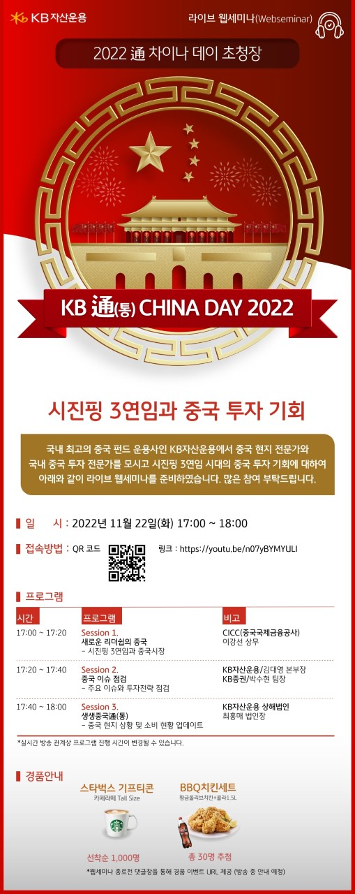 KB자산운용 유튜브 채널을 통해 참여가 가능하고, 유튜브 시청 고객을 대상으로 BBQ 치킨세트, 스타벅스 커피쿠폰을 증정한다.