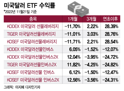 시장에선 원/달러 환율이 내년 1분기에 정점을 찍을 것이란 전망이 나온다. 이에 개인투자자들은 차익 실현을 위해 인버스 ETF 매도에 나서는 한편 레버리지 ETF를 다시 사들이고 있다.