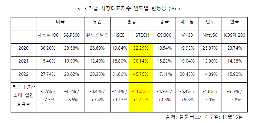 블룸버그에 따르면 지난 15일 기준 '2022년 주요 국가별 시장대표지수의 변동성'은 홍콩 '항셍테크지수(HSTECH)'가 45.75%로 가장 높았다. 항셍테크지수는 일간 등락폭이 -11.0% ~ +22.2%(3월16일 기준)에 달하는 등 연간 큰 변동성을 기록했다.
