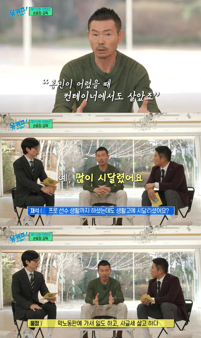 유재석은 "프로 선수였는데도 생활고에 시달리신 거냐"고 묻자 손웅정은 "많이 시달렸다"며 과거를 돌아봤다.