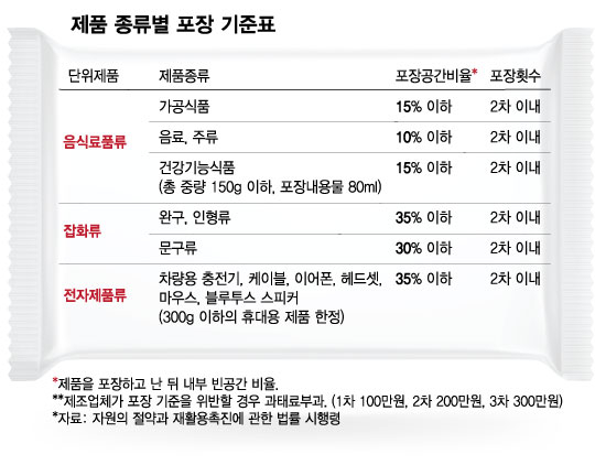 포장공간 비율은 포장을 하고 난 뒤에 내부 빈 공간 비율을 의미한다. 주류의 경우 포장 내 빈 공간이 10%를 넘기면 안 된다. 완구·인형류는 빈 공간이 35%를 넘어가면 안 된다. 포장 횟수는 제품을 포장한 횟수를 뜻한다. 와이셔츠류(1번)를 제외한 나머지 제품은 3번 이상 제품 포장을 하면 안 된다.