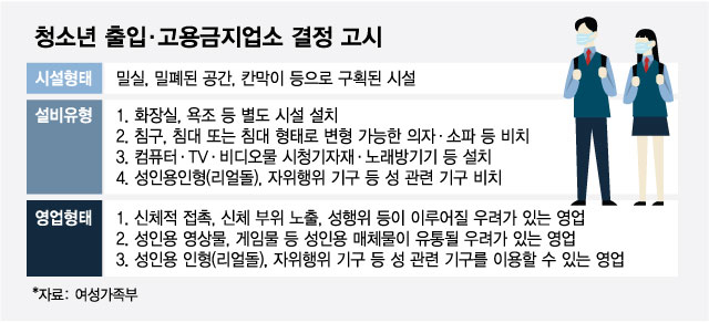관련 고시에 따르면 밀실이나 칸막이로 구획된 시설에 △화장실·욕조 △침구·침대 △컴퓨터·TV △성 관련 기구 등이 비치된 곳에 청소년 출입과 고용이 금지된다.