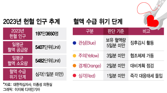 국회 보건복지위원회 소속 이종성(국민의힘) 의원실이 대한적십자사로부터 받은 헌혈 인구 추계에 따르면, 올해 헌혈 인구는 197만3650명으로 추산된다. 일평균 5407단위(유닛)의 혈액이 헌혈로 공급될 것으로 예상된다. 그러나 이는 올해 기준 일평균 혈액 소요량인 5482단위보다 적어 혈액 수급 위기 단계 중 '심각'(1일분 미만)에 해당하는 수치다.