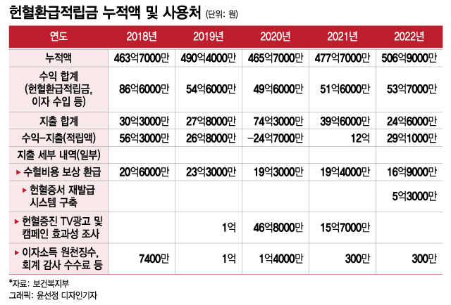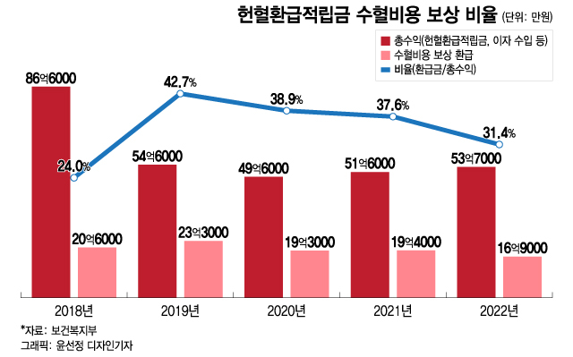 문제는 벌어들이는 50억원 안팎의 수입에 비해 지출이 적어 해마다 10억~50억원씩 적립됐다는 것이다. 헌혈환급적립금 누적액이 500억원을 넘어선 이유이기도 하다. 자금의 주된 용도가 헌혈 증서를 제출한 환자의 수혈 보상 비용인데 이 금액이 매해 20억원 안팎에 불과하다. 헌혈환급적립금 총수입에서 수혈 비용 보상에 사용된 금액의 비율은 지난해 기준 31.4%에 그쳤다.