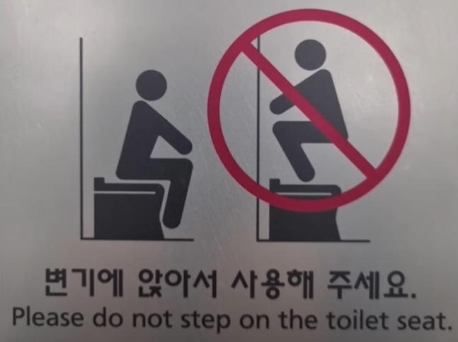 인천국제공항 화장실 용변칸 안에는 변기 위에 올라앉지 말라는 경고의 그림과 함께 '변기에 앉아서 사용해달라'는 문구가 한글, 영어, 중국어, 일본어 등 총 4개 국어로 쓰여 있는 안내문을 쉽게 찾아볼 수 있다.