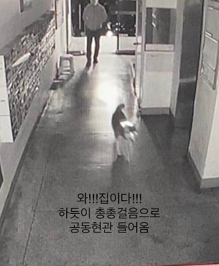 CCTV 화면을 봤다. 잃어버린지 15분 만에 공동현관 앞에 진솔이가 등장했다. 마침 한 아저씨가 뒤에서 올라오고 있었다. 진솔이는 "아저씨, 문 좀 열어주세요" 하듯 그를 쳐다봤다. 진솔이와 아저씨는 함께 들어왔다.