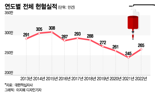 같은 기간 20대 헌혈실적도 지난해 97만120건을 기록, 10년 새 21% 줄었다. 20대 헌혈 실적이 차지하는 비중도 42.3%에서 36.3%로 감소했다. 젊은 층 기여가 줄면서 2013년 291만4483건이었던 전체 헌혈 실적은 2022년 264만9007건까지 감소한다.