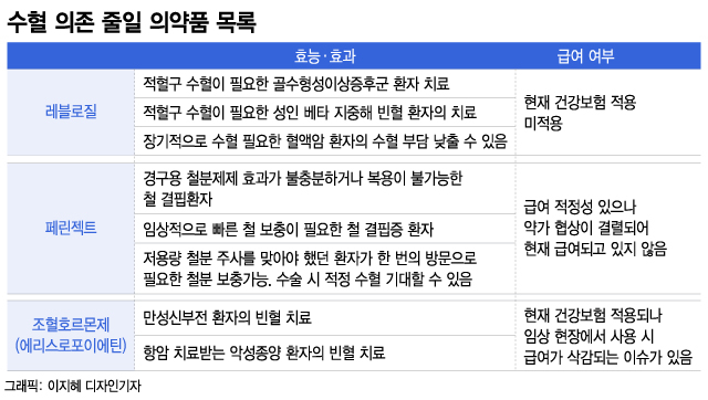 혈액암 환자의 수혈을 줄이는 신약 '레블로질'도 대안으로 언급된다. 레블로질은 골수이형성증후군(MDS) 치료제로 지난해 국내 허가를 받은 뒤 지난달에야 출시됐다. MDS 환자는 3~4주 간격마다 수시로 수혈받아야 하는데 이 때문에 삶의 질 저하가 크다. 6~7년째 지속적으로 수혈받는 환자도 있다. 레블로질은 환자의 수혈 빈도를 줄일 수 있어 출시 전부터 주목받았지만 현재 건강보험 미적용으로 널리 사용되지 못하고 있다.