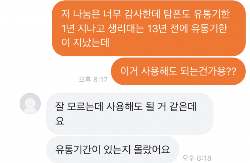 A씨가 "탐폰도 유통기한 1년이 지나고 생리대도 13년이나 지났는데 사용해도 되냐?"고 묻자 "잘 모르는 데 사용해도 될 것 같다. 유통기한이 있는지 몰랐다. 찜찜하면 버리라"는 답변을 받았다.