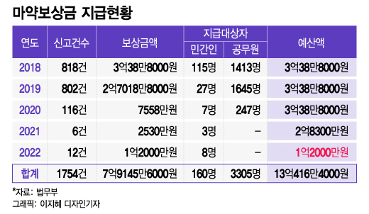 16일 머니투데이가 법무부로부터 제출받은 '마약보상금 지급현황'에 따르면 2018~2020년까지 3억여원이었던 보상금 예산은 2021년 2억8300만원으로 줄어든 데 이어 2022년엔 1억2000만원으로 대폭 삭감됐다. 올해 예산도 지난해와 비슷한 수준으로 책정된 것으로 확인됐다.