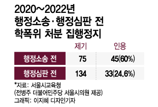 집행정지 가처분 신청을 활용하는 경우도 많다. 학폭위 처분이 부당하다는 소송이나 심판을 제기할 계획이 있는 경우 결론이 나올 때까지 학폭위 처분을 유예해달라고 주장하는 것이다. 이럴 때는 인용 결정이 내려지는 비율이 높다. 서울시교육청 자료에 따르면 2020~2022년 행정소송 전 집행정지를 제기한 경우는 75건인데 이중 45건(60%)이 받아들여졌다. 행정심판의 경우 134건 중 33건(24.6%)이 인용됐다.