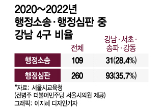 이 밖에 강남 4구(강남·서초·송파·강동)에서 학폭위 처분 이후 법적 절차를 밟는 비율이 높은 것으로도 나타났다. 이 지역 학생이 제기한 법적 쟁송은 전체 행정심판 중에서 35.7%(93건)가, 행정소송 중에서 28.4%(31건)를 차지했다.