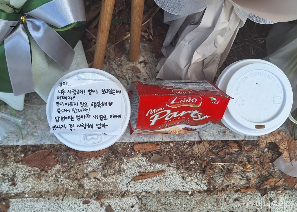 뜨거운 햇볕이 내리쬐던 7일 오전 11시쯤. 경기도 성남시 서현역 고가차도 위에는 스무개가 넘는 국화 꽃다발이 놓여있었다. 꽃송이 사이 사이에 놓인 빵과 과자, 커피. 그리고 '언니랑 같이 했던 11년이 제 인생에서 제일 행복한 시간이었어요' '그동안 저희에게 베풀어주신 은혜 너무 감사합니다' 등 가족과 지인이 쓴 것으로 추정되는 메모지가 눈에 띄었다.