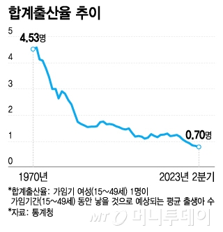 합계출산율은 가임 여성 1명이 평생 낳을 것으로 예상되는 아이 수를 뜻한다. 지난 6월 출생아 수는 1만8615명으로 2015년 12월 이후 91개월째 감소했다. 사망자 수는 2만6820명으로 출생아 수를 웃돌았다. 44개월째 인구는 자연 감소하고 있다.