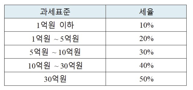 현행 상속세 및 증여세법(상증세법)에 따른 상속 및 증여에 대한 과세표준 및 세율(상속세율)은 다음과 같다.