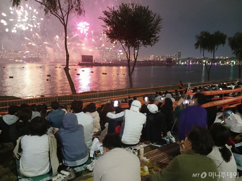 오후 6시가 넘어서자 한강 주변엔 쌀쌀한 바람이 불기 시작했다. 시민들은 담요를 깔고 두꺼운 외투를 걸쳐 입으면서도 기대감 가득한 표정을 지었다. 잔디 위에 돗자리를 깔고 앉은 사람들은 조명을 켜고 휴대폰과 카메라를 삼각대에 설치하기도 했다. 대학생 유지황씨는 "불꽃 놀이를 보기 위해 천안에서 오전 10시30분부터 출발해왔다"며 "날도 쌀쌀해지고 돌아갈 길 생각하면 걱정이 되긴 하지만 그래도 힐링하는 마음"이라고 말했다.