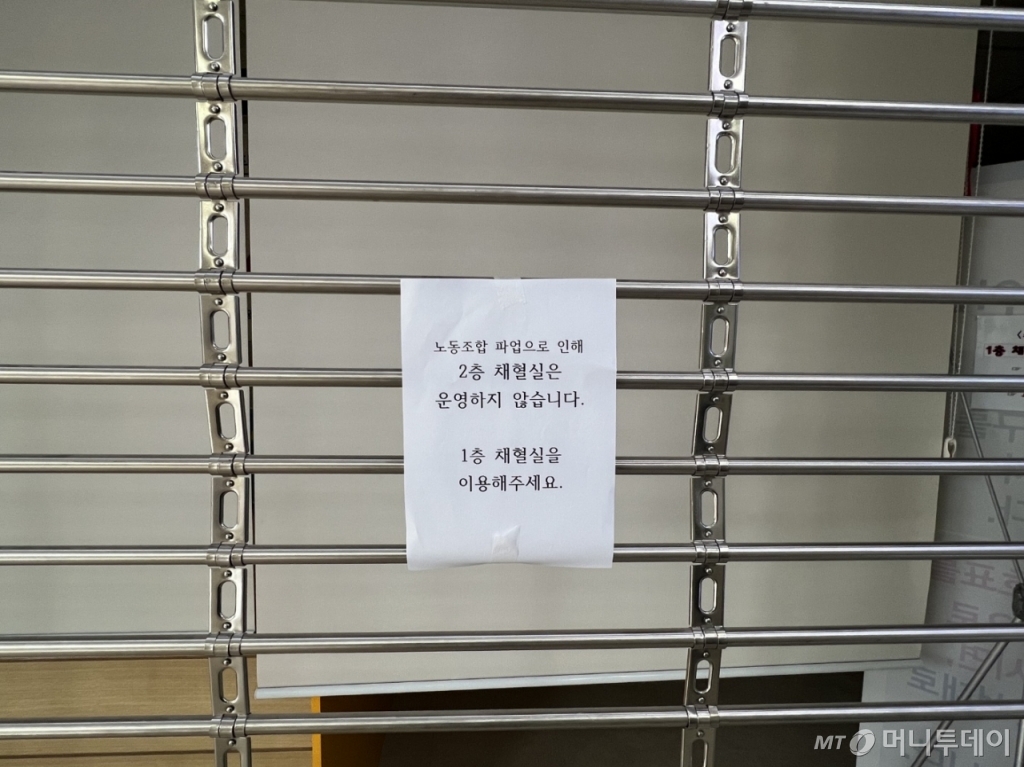50대 여성 B씨는 파업 소식을 모르고 2층 채혈실을 찾았다가 1층으로 내려갔다. 그는 기자에게 파업 사실을 듣고 나서야 "철문에 붙어 있는 문구가 그거였냐"고 물었다.
