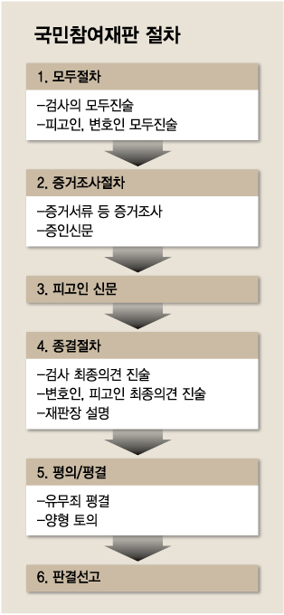 재판 순서는 △모두절차(검사, 피고인, 변호인 모두진술) △증거조사 절차(증거서류 등 증거조사, 증인신문) △피고인 신문 △종결절차(검사 최종의견 진술, 변호인 피고인 최종의견 진술, 재판장 설명) △평의와 평결(유무죄 평결, 양형토의) △판결 선고 순으로 이뤄졌다.