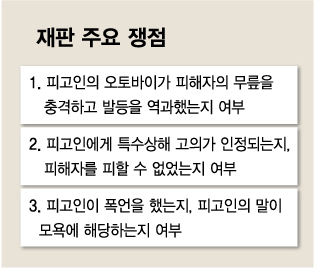 검찰에 따르면 지난해 9월17일 오후 6시25분쯤 서울 영등포구의 한 아파트에서 피고인 박씨가 오토바이를 타고 이동하던 중 이웃집 남성인 50대 공모씨가 박씨를 불러세웠다. 오토바이 통행 금지구역이니 다른 곳으로 우회해달라고 말하자 박씨는 공씨에게 욕설을 하기 시작했다. 공씨가 112 신고를 하려고 하자 박씨는 오토바이를 그대로 운전해 피해자 공씨 왼쪽 무릎을 충격하고 전치 2주의 상해를 입혔다. 박씨는 공씨가 바닥에 쓰러져 있을 때도 큰 소리로 욕설하며 모욕했다.