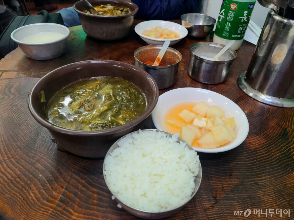이 식당 메뉴는 우거지 국밥 하나. 손님이 들어오면 식당 직원은 김이 모락모락 나는 큰 솥에서 국밥 한 그릇을 퍼 올리며 손님이 미처 자리에 앉기도 전에 음식을 가져다준다.