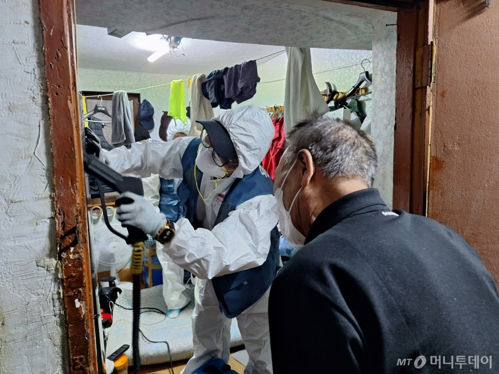 방역업체 직원들은 1평 남짓의 방 안으로 들어가더니 손전등을 꺼내들었다. 방바닥에는 바퀴벌레 퇴치 스프레이부터 가스 버너, 생수와 쌀, 각종 생활용품들이 널브러져 있었다. 직원들은 이불과 장판, 옷더미, 천장, 문틈 사이 등을 꼼꼼하게 비추며 살펴봤다.