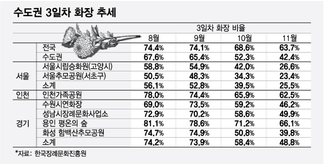 경기도의 상황도 크게 다르지 않다. 화장시설 4곳을 운영하는 경기의 지난달 3일차 화장률은 48.8%로 집계됐다. 지난 8월 경기의 3일차 화장률이 74.2%였다는 점을 감안하면 경기의 4일장 비율도 두드러지게 늘었다. 인천의 지난달 3일차 화장률은 62.5%로 수도권 중에선 그나마 상황이 나은 편이다. 수도권 전체의 지난달 3일차 화장률은 42.4%다. 전국 평균은 63.7%다.