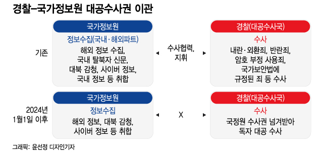 내년부터 간첩신고는 112. 국가정보원(국정원)은 해외 대공 정보 수집에 집중하고 대공수사는 경찰이 전담한다. 2020년12월 대공수사권 이관을 담은 국정원법 개정안이 국회를 통과하고 3년의 준비기간이 있었지만 경찰은 우수 수사인력 확보에 난항을 겪고 있는 것으로 나타났다. 사건마다 수사기간이 최소 5년은 넘어 송치 등 가시적 성과를 내는데 시간이 오래걸리는 특성을 경찰 내부에서 고려해주지 않아 대공수사를 전담하는 '안보경찰'이 찬밥신세이기 때문이다.
