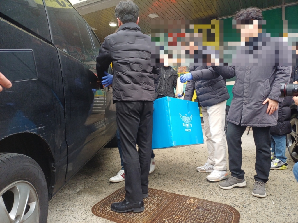 승합차를 타고 현장에 도착한 경찰은 도어락 비밀번호를 입력하고 현관문을 열어 들어가 외부 창문에 신문지를 붙여 가린 뒤 자료를 확보하기 시작했다. 경찰은 비슷한 시각 같은 배방읍에 있는 김씨의 주거지에도 수사관을 보내 압수수색을 벌였다.