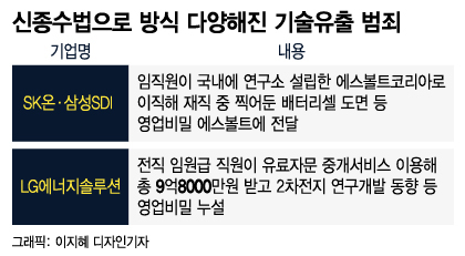 국내 배터리 업계를 선도하는 LG·삼성·SK는 모두 기술유출 사건으로 홍역을 치렀다. 국부유출로 이어질 수 있는 기술유출의 방식이 다양해지면서 검찰, 경찰 등 수사기관은 기술유출범죄에 대응하느라 수사력을 집중하고 있다.
