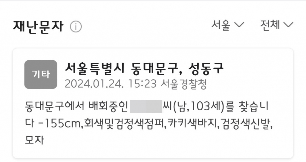 지구대로 이동하는 사이, 휴대폰에서 실종 경보 문자가 삐빅 울렸다. 문자를 보니 할아버지 이름, 나이, 주소지 등이 그대로 적혀있었다. 할아버지는 이날 오전 5시30분쯤 아내가 잠든 사이 혼자 집 밖으로 나왔다. 이를 알아차린 딸이 오전 9시쯤 인근 경찰서에 실종신고를 했다.