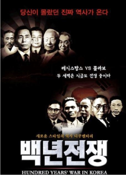'백년전쟁'은 일본이 우리나라를 강제 병합한 1910년부터 2011년까지 100년의 역사를 담은 4부작 독립 다큐멘터리 영화다. 윤봉길, 안중근 등 독립운동가 활동 시절 함께 활동한 친일파를 한 화면에서 보여주자는 의도로 만들어졌다. 미국 CIA(중앙정보국)가 이승만 전 대통령에 대해 "사적인 권력욕을 채우기 위해 독립운동을 했다"고 평가한 보고서 등을 인용하는 등 이승만의 두 얼굴을 집중적으로 다뤘다.