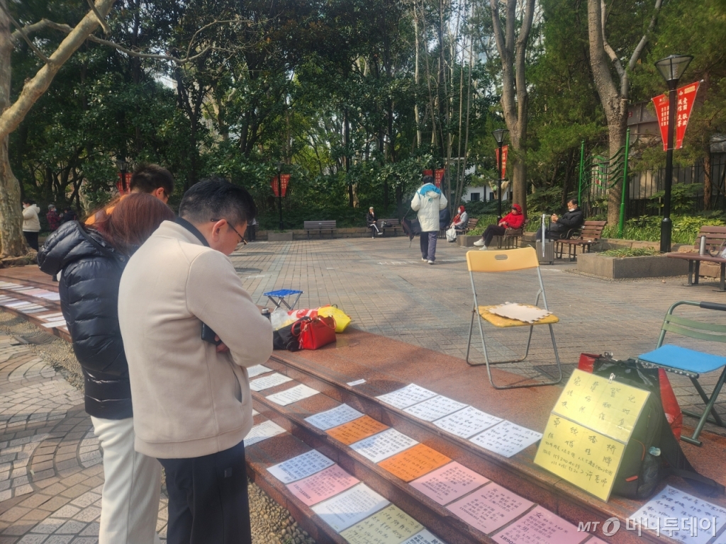 지난 2일 오전 10시35분쯤. 중국 상하이 인민공원에서 '구혼 이력서'를 살펴보던 94년생 여성 A씨가 걸음을 멈췄다. 공원에 여러장의 종이를 펼쳐두고 의자에 앉아서 기다리던 중매인이 곧바로 말을 걸었다. 어머니와 함께 공원을 찾은 A씨에게 생년월일, 주민등록지, 자가 소유 여부, 학력, 직장 등을 차례로 묻더니 곧바로 남자의 부모에게 전화를 걸었다.