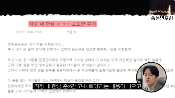 이어 "이 글을 쓴 사람은 일반 직장인이다. 우리 주변에도 이런 분들이 꽤 있다는 건데 정말 조심해야 한다. 꼭 목적이 돈이 아니고 그냥 한 사람의 인생을 골로 보내려고 무고를 할 수도 있다"고 했다.